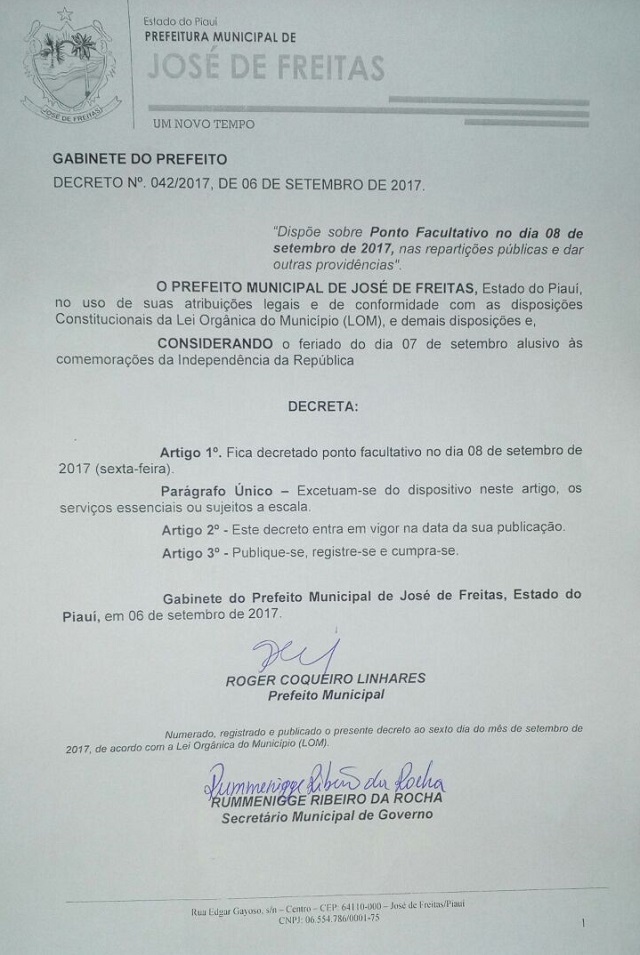 Prefeito municipal decreta ponto facultativo nesta sexta 08/09
